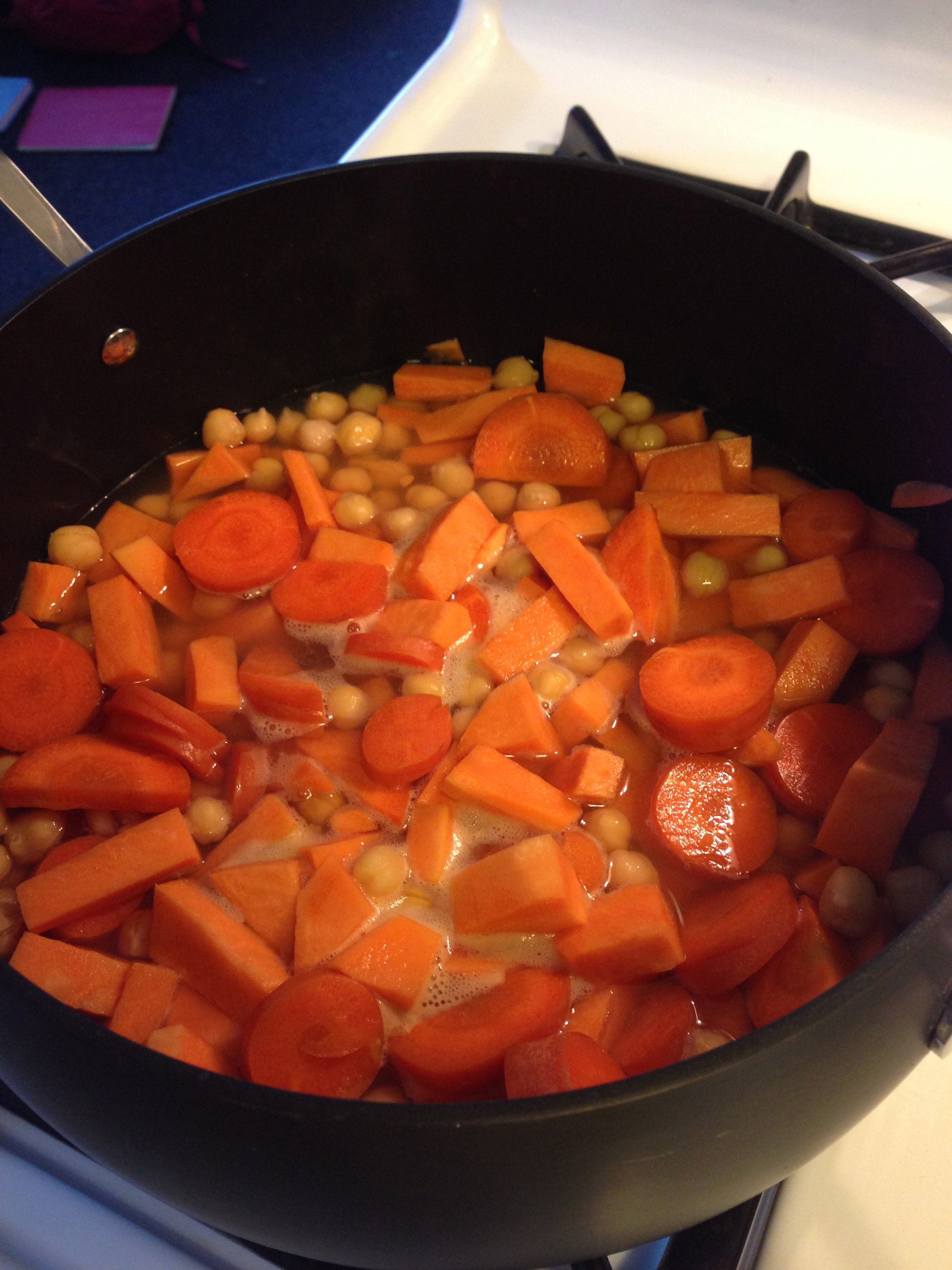 Much deliberation went into naming this dish, since the soup has sweet potato, carrots, chickpeas and curry, which are all important ingredients. It was hard to pick just two for the name. Sweet potato and curry are the flavors that burst out most, so we decided to use them.